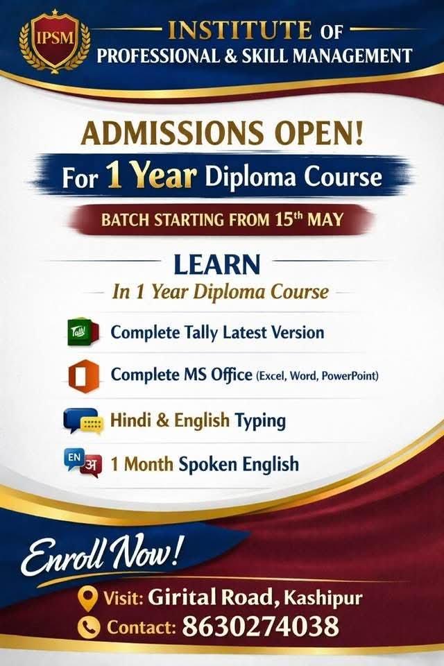 संस्थान द्वारा संचालित इस डिप्लोमा कोर्स में विद्यार्थियों को आधुनिक रोजगारपरक पाठ्यक्रमों का प्रशिक्षण दिया जाएगा। इसमें टैली के नवीनतम संस्करण, एमएस ऑफिस (एक्सेल, वर्ड, पावरपॉइंट) तथा हिंदी एवं अंग्रेज़ी टाइपिंग का व्यापक प्रशिक्षण शामिल है। इसके अतिरिक्त विद्यार्थियों के व्यक्तित्व विकास एवं संचार कौशल को बेहतर बनाने के उद्देश्य से 1 माह का स्पोकन इंग्लिश कोर्स भी कराया जाएगा। संस्थान प्रबंधन का कहना है कि वर्तमान प्रतिस्पर्धात्मक दौर में तकनीकी एवं कंप्यूटर ज्ञान के साथ-साथ प्रभावी संचार कौशल युवाओं के लिए अत्यंत आवश्यक हो गया है। इसी उद्देश्य को ध्यान में रखते हुए यह पाठ्यक्रम तैयार किया गया है, ताकि छात्र-छात्राएं कम समय में व्यावहारिक ज्ञान प्राप्त कर रोजगार के बेहतर अवसर हासिल कर सकें। इच्छुक अभ्यर्थी संस्थान के गिरीताल रोड स्थित परिसर में जाकर प्रवेश संबंधी जानकारी प्राप्त कर सकते हैं या दिए गए संपर्क नंबर 8630274038 पर संपर्क कर नामांकन प्रक्रिया पूरी कर सकते हैं। संस्थान ने सीमित सीटों के चलते अभ्यर्थियों से समय रहते आवेदन करने की अपील की है।